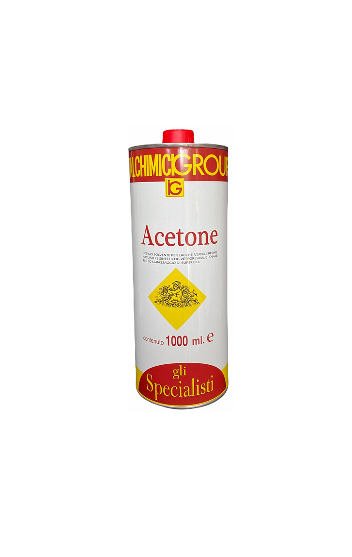 Acetone puro, ottimo solvente per grassi, oli, cere, resine, gomme, plastica, pitture, vernici, collanti, a base di gomma. Sgrassante e smacchiante per superfici metalliche, legno, marmo, laminati, plastica, stoffe, ecc. Si può usare sia a pennello sia ad immersione. Non intacca i metalli. A rapida essiccazione. Confezione da 1L.