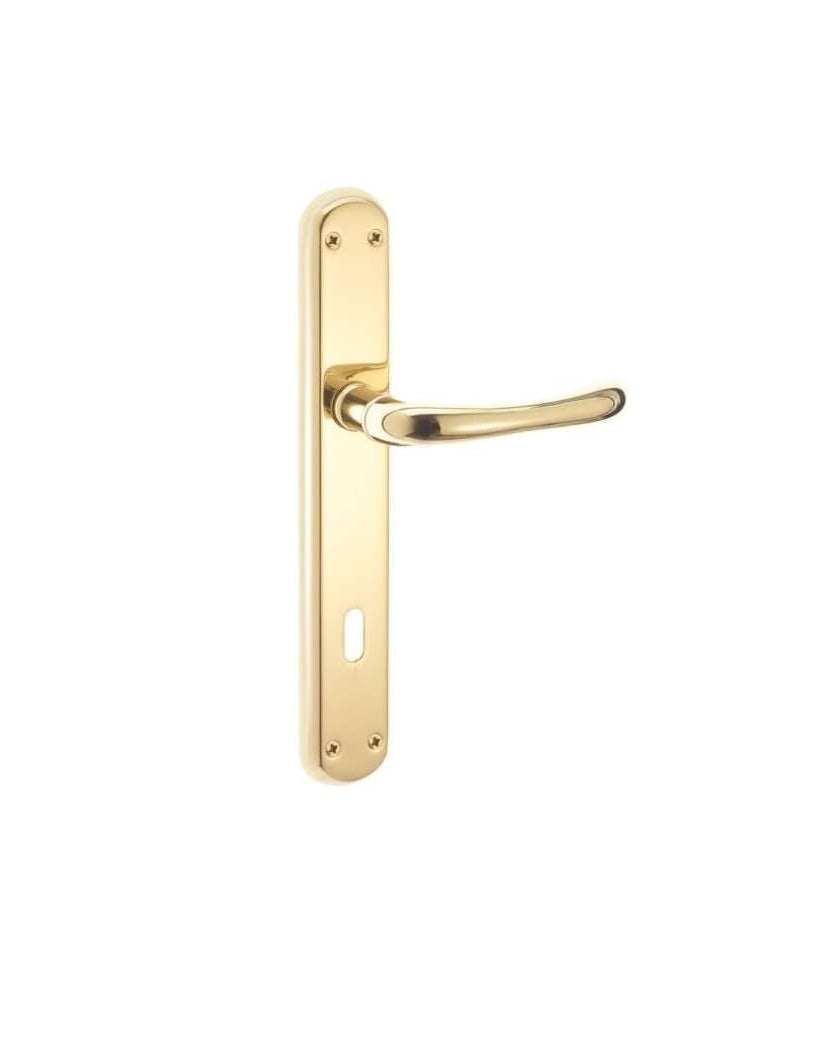 Maniglia Hoppe con placca ottone lucido, disponibile Q8x70 e Foro Yale.