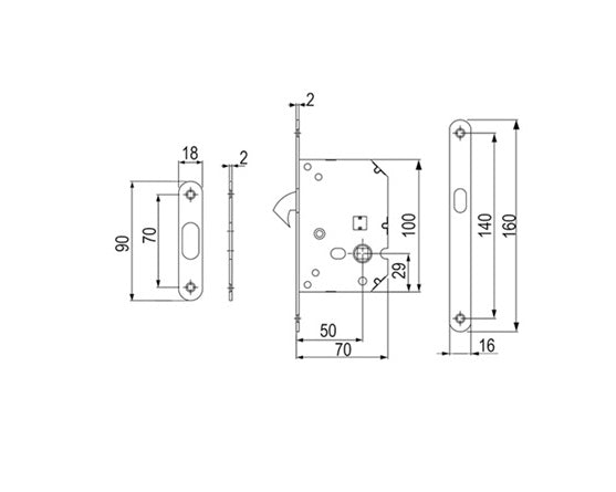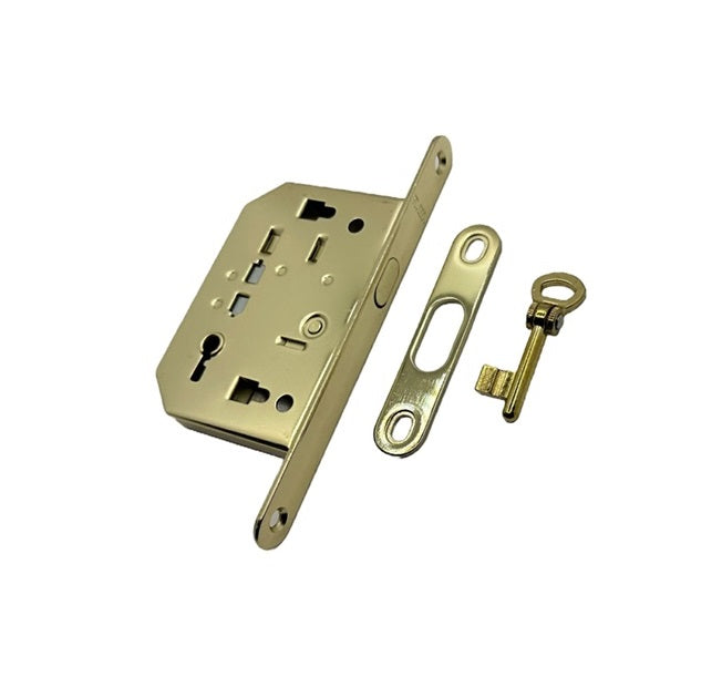 Serratura a gancio per porte scorrevoli, entrata 50, frontale 16mm. Finitura Ottonata, Bronzata e Cromo satinata. Corredata di contropiastra e chiave. Disponibile, a parte, la chiave pieghevole.
